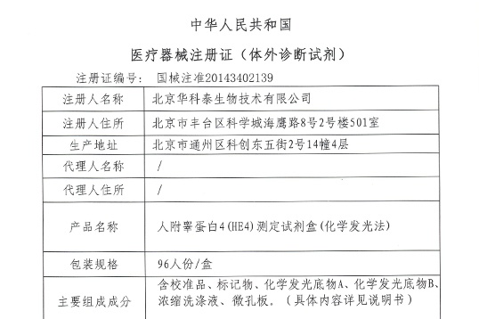 取得肿瘤标志物新HE4注册证,肿瘤检测菜单15项;